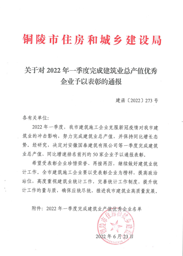 關(guān)于對 2022年一季度完成建筑業(yè)總產(chǎn)值優(yōu)秀企業(yè)予以表彰的通報(bào)?