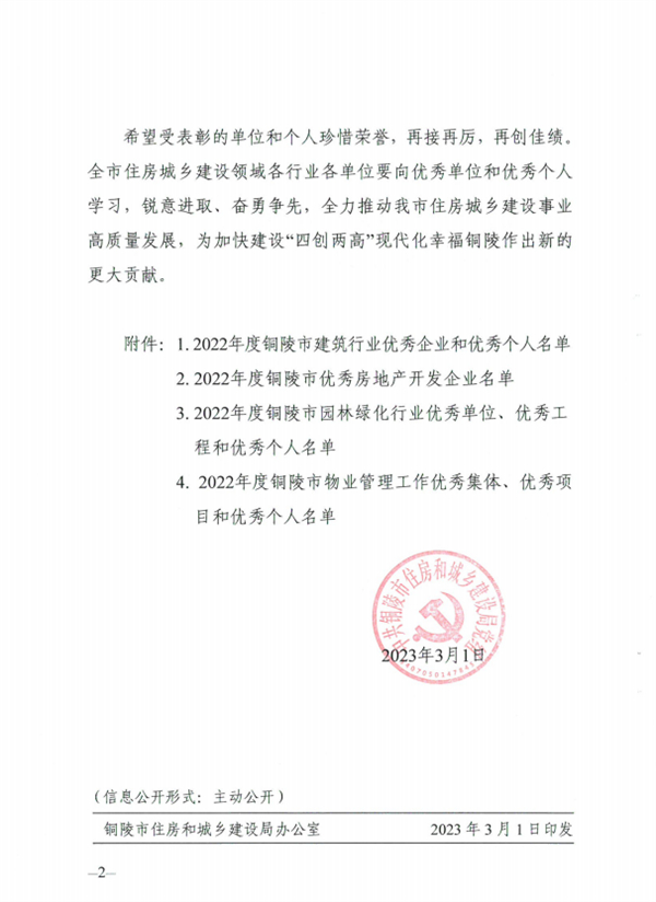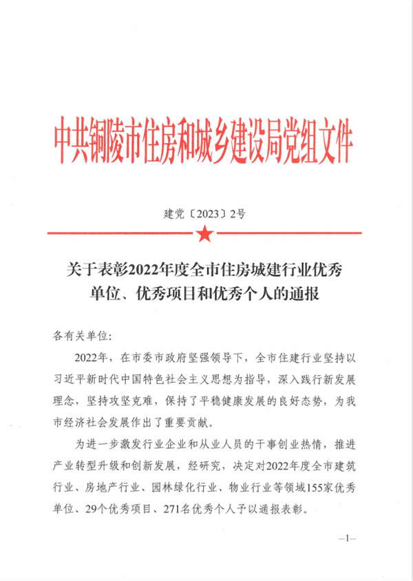公司榮獲2022年度全市住房城建行業(yè)優(yōu)秀單位、優(yōu)秀項目和優(yōu)秀個人的通報