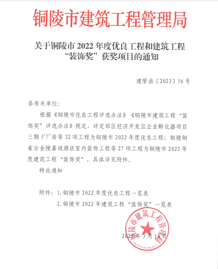 建管函56號(hào)關(guān)于銅陵市2022年度優(yōu)良工程和建筑工程“裝飾獎(jiǎng)”獲獎(jiǎng)項(xiàng)目的通知.pdf